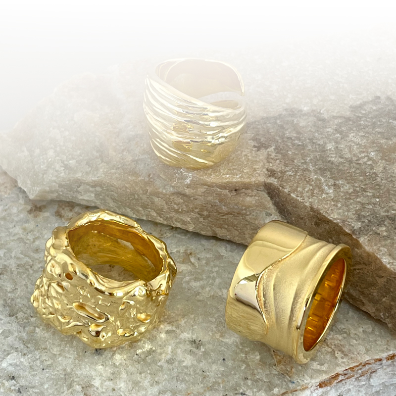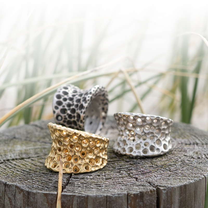 Die breiten Ringe sind echte Statement Ringe und von von der Natur inspiriert oder von einem besonderen Thema. Die Ringe sind aus recyceltem Silber oder mit 18kt Gold veredelt. Hier findest Du breite Ringe wie Wickelringe, Knotenringe oder Treibholzringe. Auch in alle diese Ringe kannst Du Diamanten fassen lassen. Die Statementringe findest Du hier.