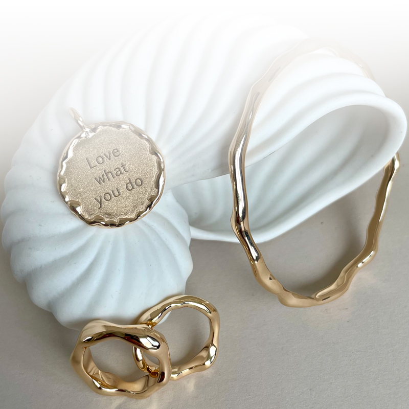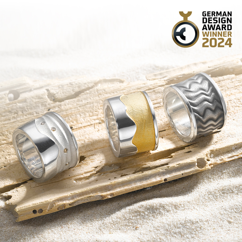 Die Idee entstand in den Jahren, in denen ich an der Nordsee gelebt habe. Bei langen Strandspaziergängen mit Skizzenbuch und Kamera. Aus meinen Eindrücken wurde eine Schmucklinie, die das Spiel von Ebbe und Flut künstlerisch einfängt – ausgezeichnet 2024 mit dem German Design Award.