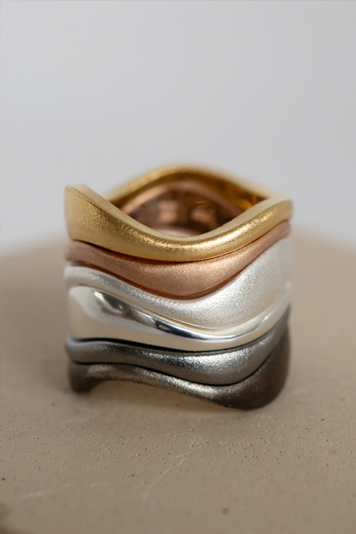 So wie eine Welle auf die nächste folgt, folgt ein WATERKANT Wellenring dem anderen. Jeder WAVE Ring kann mit einem weiteren kombiniert werden und passt durch sein aussergewöhnliches Design und durch eine Drehung genau auf den anderen. Er kann sowohl einzeln auch als zu mehreren getragen werden. Einzeln getragen wellt er sich harmonisch um den Finger und wirkt durch seine pure Eleganz. Zu mehreren am Finger getragen ist der WAVE Ring wie eine Welle, die auf die nächste folgt, so wie die unendliche Abfolge der Meereswellen im Spiel der Gezeiten.